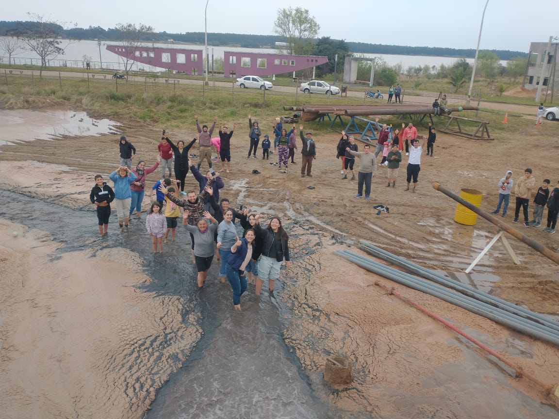 Todo es alegría y emoción por la salida de agua termal a 1.105 metros de perforación en la ciudad de Santa Ana, departamento Federación, tras un año de excavación y de que el pasado miércoles se concluyera con la perforación del pozo.