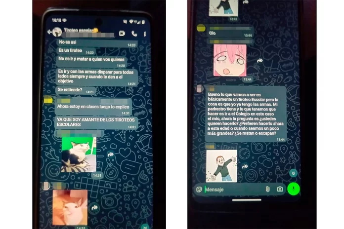 “Tiroteo escolar”, es el nombre del grupo creado por los chicos, de entre 15 y 16 años, en el que intercambiaron mensajes con la supuesta estrategia para concretar el plan. Las imágenes de las conversaciones fueron viralizadas por los padres de los estudiantes y la Justicia intervino en el caso.