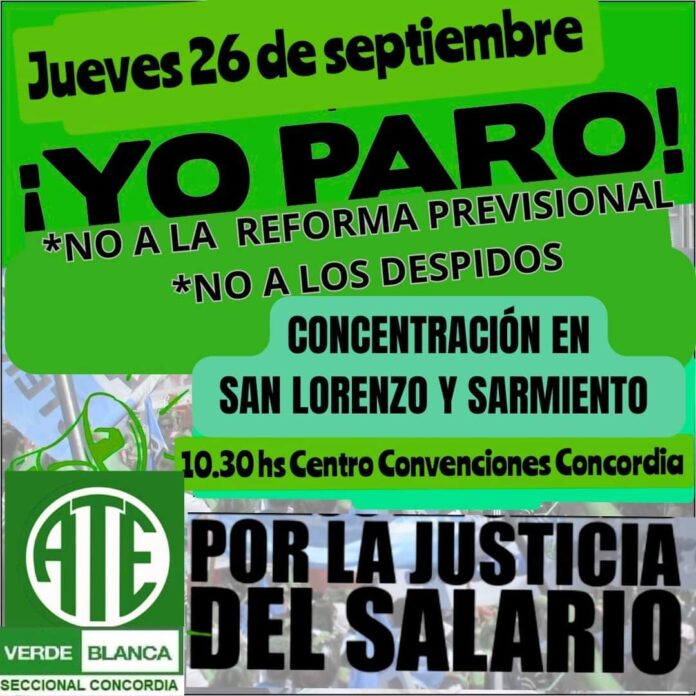 A su vez, la Seccional Concordia de A.T.E. anunció esta mañana su adhesión al paro nacional convocado por ATE Nación, con asambleas y movilizaciones, y convocan a manifestarse a las 10 de la mañana, en el Centro de Convenciones local. «Ya se realizaron todas los notificaciones correspondientes a los distintos Sectores Laborales y a los Ministerios y Secretarias de Trabajo denunciando las medidas de fuerza para el próximo 26 de septiembre»