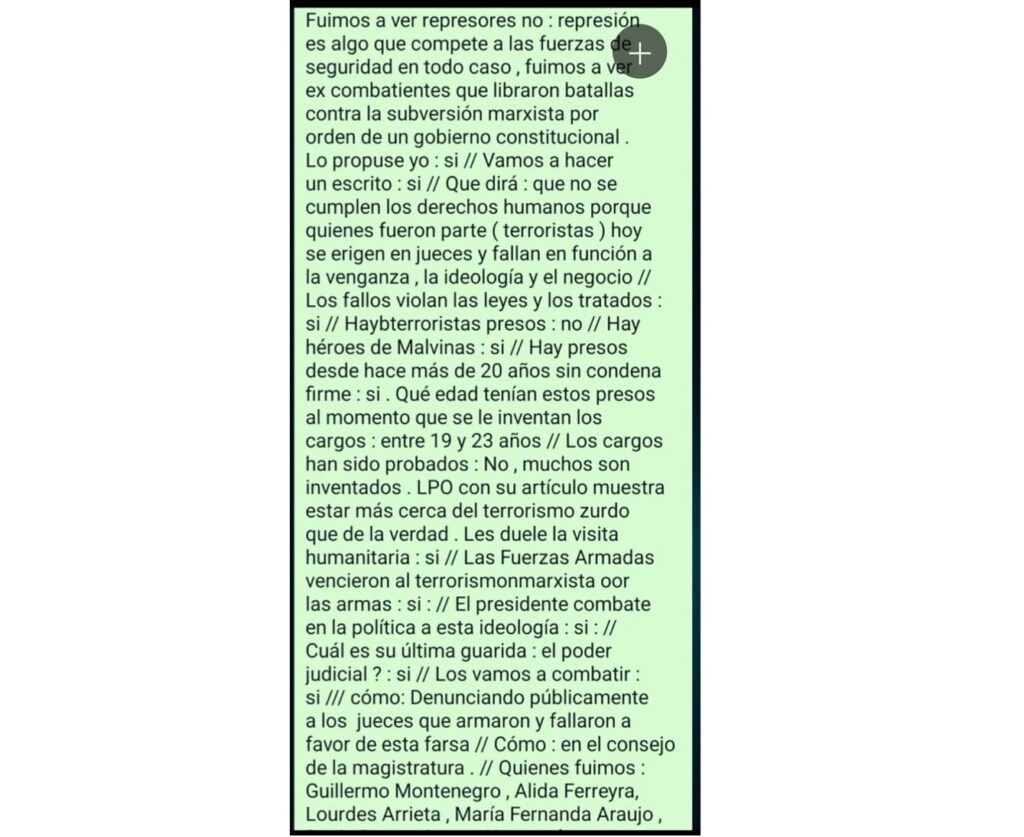 Benedit habló en el grupo de Whatsapp del bloque libertario. Allí dio sus argumentos, defendió el accionar de la dictadura y anunció denuncias contra los magistrados que fallaron condenando a los detenidos Alfredo Astiz, Raúl Guglielminetti y Carlos Suárez Mason. “Fuimos a ver represores? no: represión es algo que compete a las fuerzas de seguridad en todo caso, fuimos a ver ex combatientes que libraron batallas contra la subversión marxista por orden de un gobierno constitucional”, argumentó Benedit en el chat.