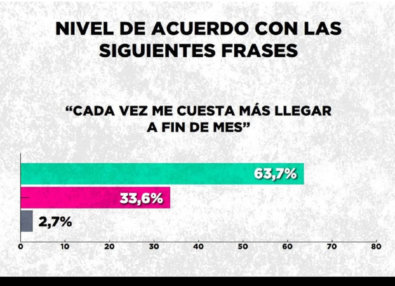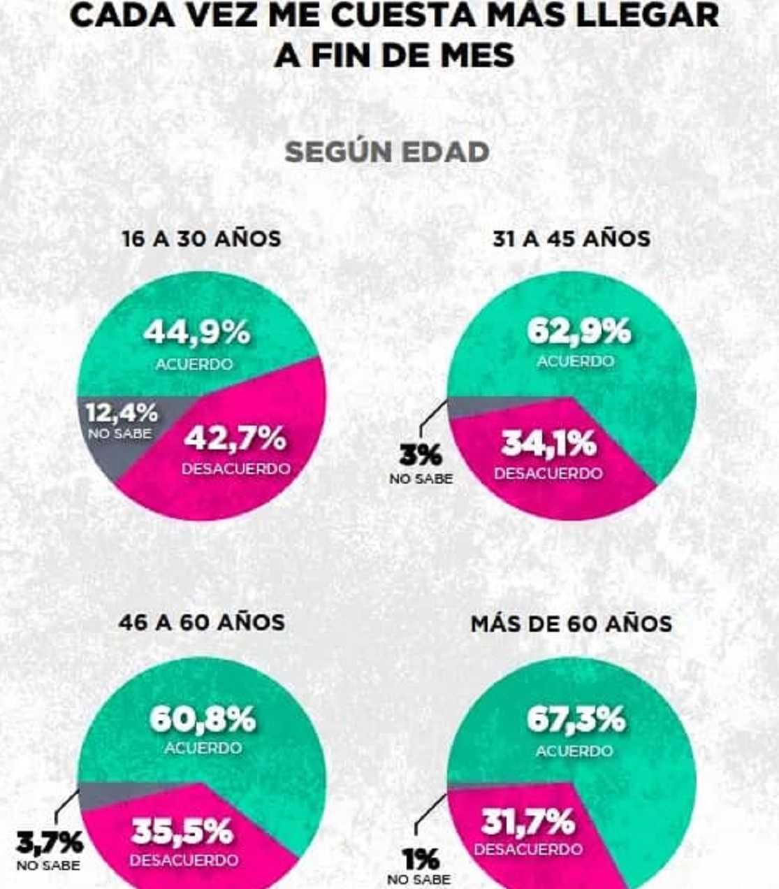 Además, el 63.7% de los encuestados asegura que cada vez les cuesta más llegar a fin de mes, una percepción que se acentúa entre los jóvenes de 16 a 30 años, donde el 56.7% no logra cubrir sus gastos mensuales sin problemas. Este grupo etario, clave en el tejido social y laboral, parece ser uno de los más afectados por la falta de recuperación económica.