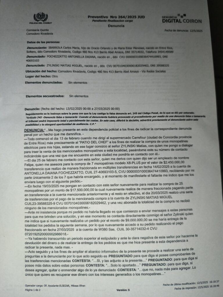 En comunicación con cronistas de El Sol-Tele5, Carlos Ibarrola comentó que: “yo me encontraba paseando por la ciudad de Concordia y justo me dirigí hacia el supermercado Carrefour, donde vi que había monopatines eléctricos, me pongo a charlar con la persona responsable que es Matías Zylisnki, es de Buenos Aires y me empieza a decir la característica de los monopatines y me ofrece para que lo pruebe ahí en el en el establecimiento, lo cual yo accedo a probarlo y quedé contento con el monopatín, entonces le pregunto ¿cuál era su precio? él me empieza a decir el precio y de ahí sale la conversación para poder comprarle una cantidad de cinco monopatines porque me estaba interesado en venderlo acá en Comodoro Rivadavia lo cual él accede a esta petición condicionándome que por favor no lo venda en concordia y que no tenía ningún problema y bueno todo se inició con esta compra, con lo cual, le compré cinco monopatines eléctricos, le pedí número a él y justo ese mismo día me dice que se inauguraba a la noche, esto fue a la tarde y se inauguraba la noche el famoso patio que me había invitado para estar en la inauguración donde iban a mostrar las motos eléctricas y los monompatines eléctricos. Yo asisto a esa inauguración donde se encontraba el intendente de Concordia y varias personas más. Luego de transcurrir unos días me vuelvo a poner en contacto con él ofreciéndole comprar nuevamente monopatines eléctricos, lo cual él me dice que no tenía ningún problema y me pasó el número de su empleado el 25 de febrero, me pongo en contacto con este señor que se llama Felipe, quien me asesora para la compra de siete monopastines eléctricos modelo X8 Plus por un valor de $ 2,450,000 mil y a la hora de de realizar el pago me llamó un poco la atención porque me pasó un alias que estaba a nombre de una chica que se llama Antonella Daiana Fochesato, lo cual realizo la compra y una vez realizada la compra Felipe me transmite por parte de su jefe que estos iban a tener una demora de una semana para poder entregármelo. Luego de transcurrido una semana me vuelvo a comunicar con él y me dijo que solamente me podía entregar dos de los siete monopatines que le había comprado, seguido a esto ya habían transcurrido dos semanas, lo cual, él (Felipe) me vuelve a lanzar una nueva oferta por pedido de su jefe, ofreciéndome una nueva compra de un nuevo modelo de monopatines diciéndome que si le compraba 10 monopatines ellos me bonificaban el flete, yo accedí a esta compra y me vuelve a tirar otra oferta más que si le compraba 15 monopatines ellos me regalaban un monopatín de regalo, que es el modelo X10, que es un modelo casi todo terreno por así decirlo, y si le compraba 25monopatines, ellos me iban a regalar una bicicleta eléctrica para yo poder exhibirla en Comodoro Rivadavia. Esta oferta para mí fue un desafío, así que me pongo en contacto con amigos, compañeros, familiares y les empiezo a ofrecer a todos si estaban interesados en comprar, lo cual, el monto a pagar por estos monopatines era de $17,500,000 pesos, lo que nuevamente vuelvo a transferir a esta chica Antonela Diana Fochesato, una parte a ella, la otra parte fue entregada en efectivo, y la otra parte se la transferí a él (Matías Zylinski) pero antes de pagárselo, él me había puesto una condición, que era entregarme cinco monopatines por semana. Pasó la siguiente semana y él me decía que iba a recibir los monopatines los viernes de cada mes, y yo esto mismo le transmití a la gente que me habían encargado, por lo cual la siguiente semana solamente me entregó, de los 25 monopatines, me había entregado 4, a todo esto, yo ya empecé a sentir presión porque había realizado una venta en total de 17 monopatines, lo cual, yo ya le había prometido a la gente que iba a entregar 5 por semana y no podía cumplir con el requisito”, dijo resignado Ibarrola.