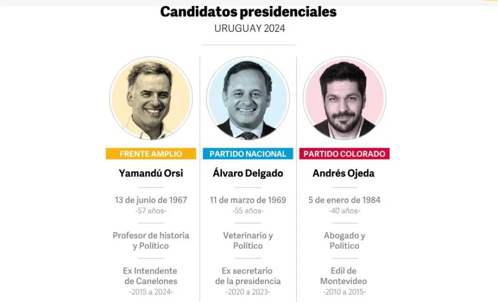 En el último sondeo de la consultora Factum, el candidato presidencial del Frente Amplio, Yamandú Orsi, suma el 45,5% de los votos. Detrás aparece el referente del presidente Luis Lacalle Pou, Álvaro Delgado, con el 25,1% y en tercer lugar el mediático abogado penalista, Andrés Ojeda, con el 15%. El resto de los candidatos por debajo del 4%.
