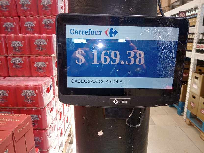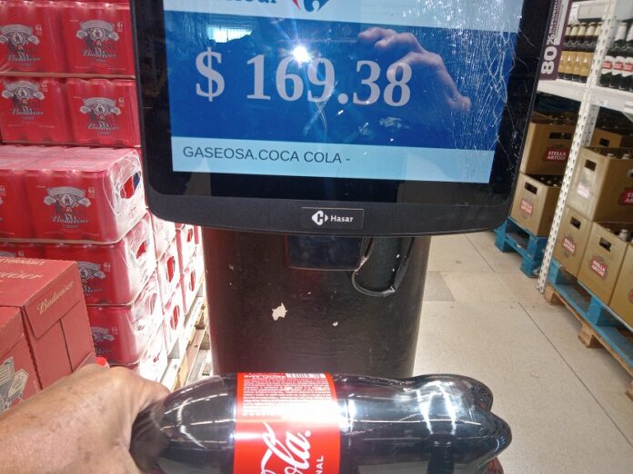 Apenas pasados unos minutos del mediodía de este miércoles, un vecino fue a comprar una bebida gaseosa fría al Hipermercado Carrefour, tomó una Coca Cola de litro y medio y la pasó por el escáner de los precios, este le dio $169.38, con lo cual el vecino se tentó por el precio al considerar que por ser de primera marca estaba en un buen precio, pero al pasar por la caja se llevó una sorpresa.