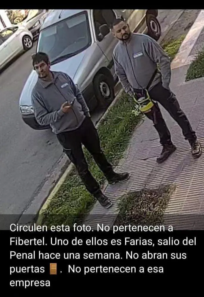 Circula por las redes sociales y grupos de usuarios de redes sociales que dos personajes -cuyas fotos son difundidas- no son instaladores de ninguna empresa de telefonía o de televisión por cable sino CACOS que buscan abran las puertas de los domicilios para perpetrar ilícitos, si golpean en su casa, llame a la Policía.