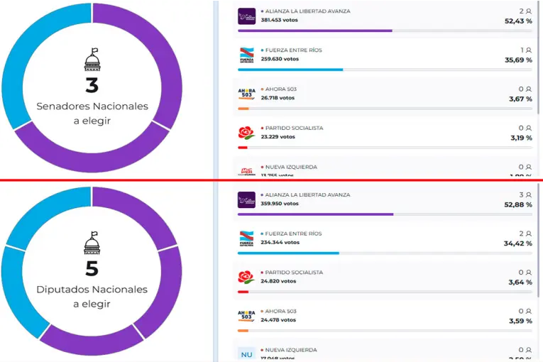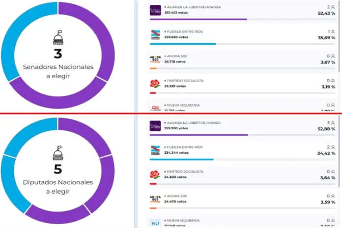 Los resultados comenzaron a conocerse a las 21.30, y con el 94,09% de las mesas escrutadas, los resultados oficiales en la provincia de Entre Ríos, arrojan que Alianza La Libertad Avanza, encabezada por el Gobernador, Rogelio Frigerio, se impone en las elecciones legislativas y toma ventaja sobre Fuerza Entre Ríos.