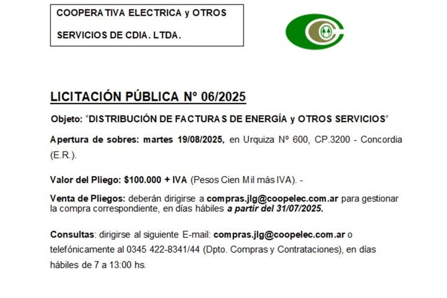 InicioEconomíaLa Cooperativa Eléctrica de Concordia llama a licitación para la distribución de... Economía La Cooperativa Eléctrica de Concordia llama a licitación para la distribución de facturas By cable informacion 30 julio, 2025 0 116 Cuota FacebookTwitterPinterestWhatsApp - Publicidad - La Licitación Pública N° 06/2025 tiene como objeto: la “distribución de facturas de energía y otros servicios”. - Publicidad - Cuota FacebookTwitterPinterestWhatsApp Artículo anteriorLa «Sala de Mediación y Conciliación» ocupará las oficinas de la ex Radio CiudadanaArtículo siguienteFEDERAL: Una mujer entregó un auto y transfirió $12 millones por una camioneta que nunca llegó cable informacionhttps://cableinformacion.com.ar/category/interes-general/DESDE CONCORDIA PARA TODO EL MUNDO Mas noticias Economía Legisladores millonarios: Informaron el patrimonio que cada diputado nacional de Entre Ríos 12 octubre, 2025 Economía Hay 7 empresas que se presentaron interesadas en explotar la Ruta Nacional 14 8 octubre, 2025 Economía LA INSTITUCIÓN QUE NUCLEA A LOS COMERCIANTES Y EMPRESARIOS LOCALES, SUGIERE UNA MODIFICACIÓN EN EL HORARIO DE ATENCIÓN AL CLIENTE 4 octubre, 2025 DEJA UNA RESPUESTA Cancelar respuesta Comentario: Por favor ingrese su comentario! Nombre:* Por favor ingrese su nombre aquí Correo electrónico:* ¡Has introducido una dirección de correo electrónico incorrecta! Por favor ingrese su dirección de correo electrónico aquí Sitio web: Guardar mi nombre, correo electrónico y sitio web en este navegador la próxima vez que comente. - Publicidad -