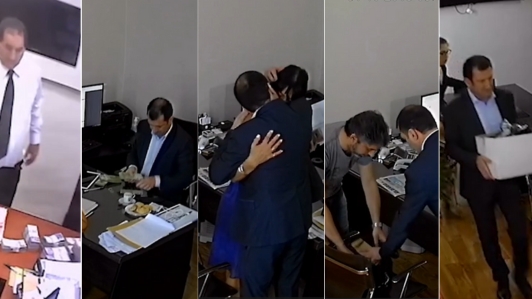 En una de las secuencias, Kueider y Mariela Teruel, quien entonces era subsecretaria de Gestión Administrativa y Asuntos Jurídicos de Entre Ríos, cuentan fajos de billetes y los guardan en una bolsa color crema, que luego cierran con una abrochadora. Minutos después, una persona ingresa a la oficina y retira la bolsa.