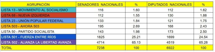 En segundo lugar se ubicó Fuerza Entre Ríos, con 1.825 votos para senadores y 1.699 para diputados, mientras que el Partido Socialista obtuvo 143 y 173 votos, respectivamente.