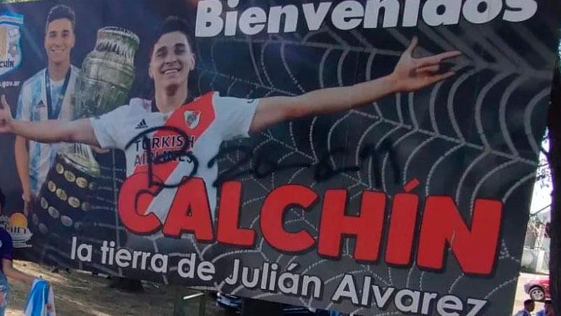 Un día después, amaneció vandalizado. Con aerosol escribieron “B-26-6-11”. Se trata de la fecha en que el equipo Millonario empató con Belgrano y sentenció su caída a la segunda categoría del fútbol argentino. El periodista Iván Alvarenga compartió cómo quedó el cartel arruinado luego de la caravana y expresó su repudio. “Lo inservible como persona que tenés que ser para vandalizar el cartel del pueblo de Julián Álvarez”, comenzó diciendo. Y agregó: “Igual no importa porque ya quedó viejo, ahora van a poner uno con la del Mundo. Besitos para todos los mononeurales”.