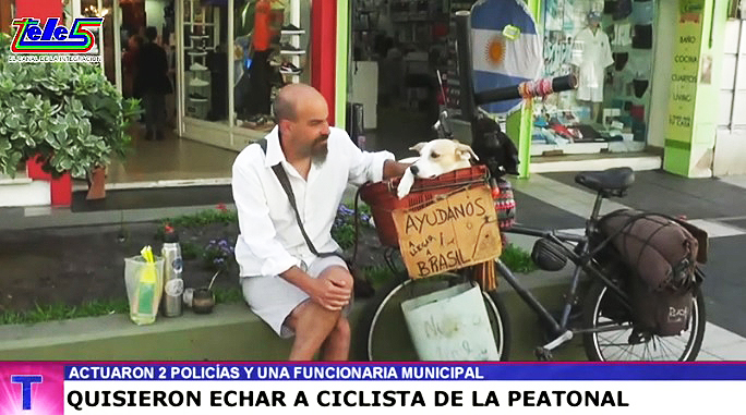 Un hombre oriundo del barrio de Caballito (Buenos Aires) que recorrió varios países y varias provincias argentinas a puro pedal con su fiel compañera, una perrita que adoptó en Perú como su inseparable compañera de ruta, pasó un mal momento en la peatonal de nuestra ciudad cuando estaba vendiendo artesanías de su creación (pulseras) y una funcionaria municipal llamó una patrulla de comedidos policías que, lejos de estar atentos a la prevención del delito o poniendo tras las rejas a los malvivientes, querían llevarlo preso y encerrar a su mascota por estar descansando y tomando mates.