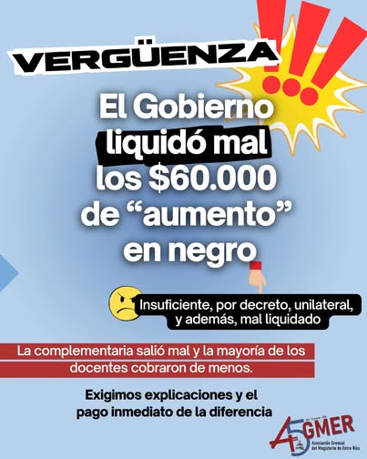 No obstante, durante la mañana del mismo día, la Asociación Gremial del Magisterio de Entre Ríos (Agmer) denunció inconsistencias en la liquidación a través de sus canales oficiales. Según señalaron, el incremento fue otorgado de manera unilateral, resulta insuficiente y, además, fue mal calculado.