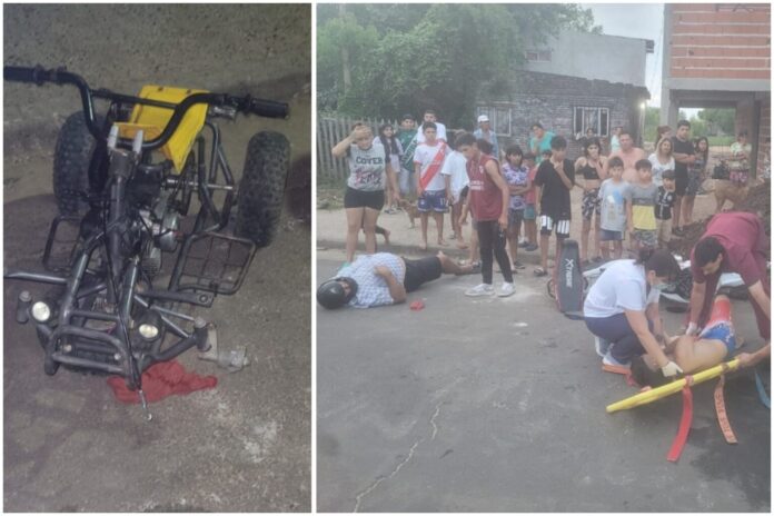 Un menor de 12 años que se encontraba en la calle realizando maniobras en un cuatriciclo, colisionó contra una motocicleta conducida por un masculino de 55 años, quien circulaba por calle Carretera de la Cruz sentido norte a sur. Por el hecho, informó personal policial, ambos sufrieron heridas de gravedad y fueron internados en el Hospital Masvernat.