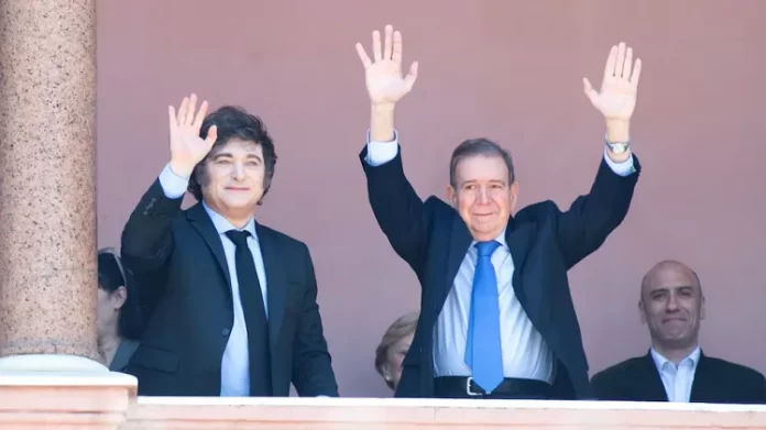 Al terminar, ambos salieron al balcón principal, acompañados por sus respectivos entornos. Se abrazaron y saludaron largamente a los miles de venezolanos de la diáspora en la Argentina que ocupaban un tercio de la Plaza de Mayo y los vivaron apenas vieron que abrirse las puertas ventanales del primer piso. “Viva la Libertad”. “Gracias, Milei”. “Edmundo presidente”, gritaban, envueltos en banderas de su país. Algunas mujeres estaban apostadas frente a la reja desde las 8.30 de la mañana; otros habían llegado hacia el mediodía, decididos a recibir a Milei con vociferadas y calurosas palabras de aliento, entre hurras y agradecimientos.