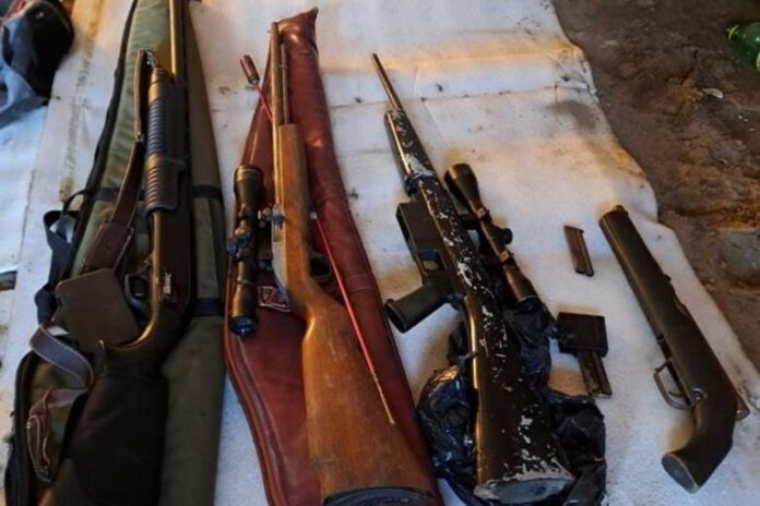 En el otro domicilio de la misma jurisdicción es donde se encontró el arsenal de armas secuestrando 22 cartuchos calibre .22 largo, 2 rifles calibre .22 largo, con miras telescópicas y almacenes cargadores, 1 estuche para rifle con baqueta, 1 escopeta calibre 12/70, con su respectivo estuche y correa, 2 cartuchos completos calibre 12/70 , 2 cartuchos calibre 12/70, 1 mochila con equipo de comunicación (HT y cargador), 1 balanza de precisión, 1 teléfono celular, 2 pistoleras, 1 porta almacenes cargadores de pistola, 2 almacenes de cargadores calibre 9mm, 1 caja de municiones con 23 cartuchos 9mm, 1 pistola calibre 9mm y 1 chaleco porta placas con dos paneles balísticos no identificables. Quedando aprendidos un hombre de 27 años y una mujer de 28 años de edad.