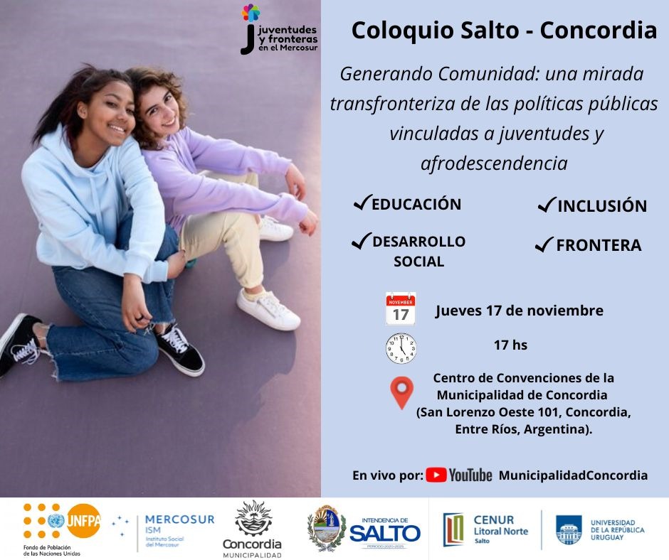 Universidad de la República Oriental del Uruguay (UDELAR), la Universidad Nacional de Entre Ríos, la Municipalidad de Concordia y la Intendencia de Salto; invitan al Coloquio “Generando Comunidad – Coloquio Salto Concordia. Una mirada transfronteriza de las políticas públicas vinculadas a juventudes y afrodescendencia”.