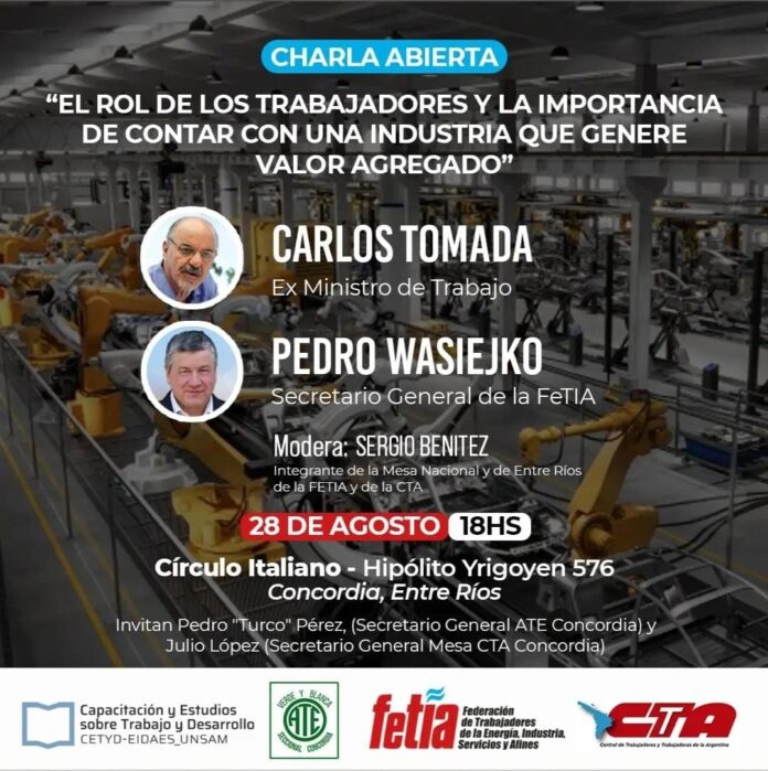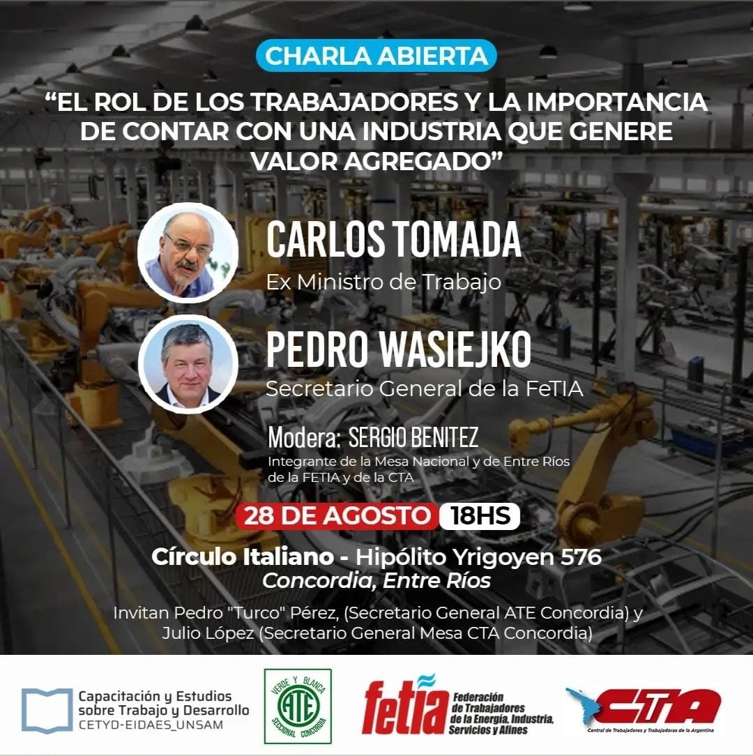 Por otra parte, a las 18 horas Tomada y Wasiejko brindarán una Charla Abierta sobre “El rol de los trabajadores y la importancia de contar con una industria que genere valor agregado” en el Círculo Italiano, en Hipólito Yrigoyen 576. Esta actividad contará con la moderación de Sergio Benitez.