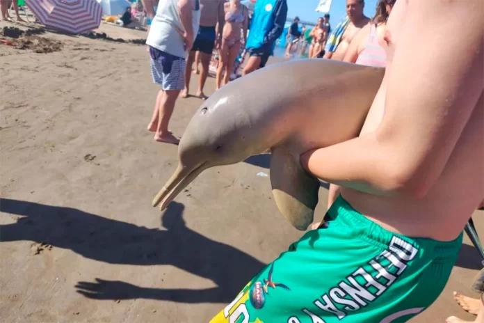 El incidente ocurrió cuando un grupo de turistas avistó al animal varado cerca de la orilla. Uno de ellos, aparentemente con intenciones de ayudar, decidió sacarlo del agua, acción que resultó fatal para el delfín. Lorena Cervetto, vecina del lugar y testigo del hecho, documentó la escena y compartió su pesar en redes sociales: “El delfín murió en sus brazos, rodeado de curiosos. No sabemos qué hacer en estas situaciones, y eso es alarmante”.