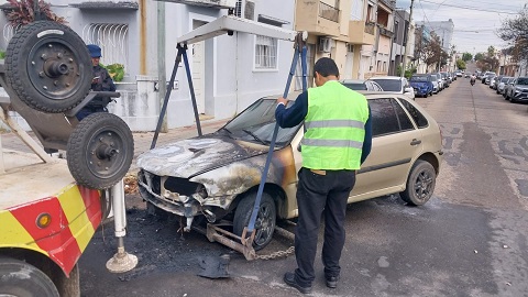 El vehículo afectado fue un Volkswagen Gol -de 5 puertas- que sufrió importantes destrozos en su motor y en toda la parte delantera del habitáculo, luego de que se declaró un incendio por causas que aún se tratan de establecer.